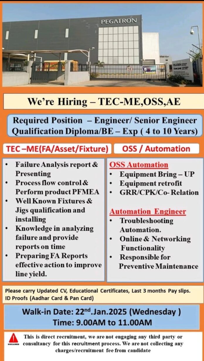 Pegatron Company Walk-in Interview for TEC-ME, OSS ,Automation Equipment 2025